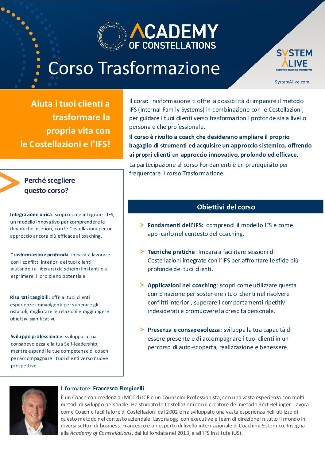 Lavorare con le Costellazioni Sistemiche mi aiuta a guidare i miei clienti nell’agire grandi e profondi cambiamenti per se stessi, per il loro team o la loro organizzazione. Il programma sviluppato da Francesco e il modo in cui conduce il training, infondono sicurezza nell’utilizzare questo approccio sistemico e olistico nella pratica professionale.